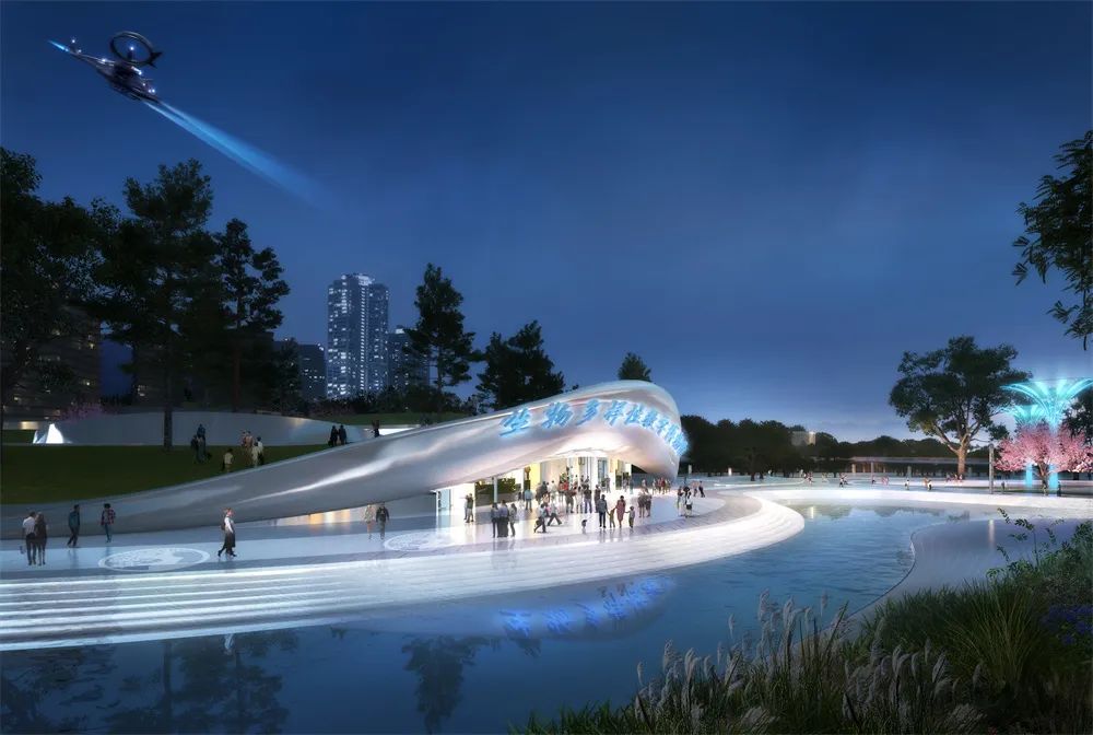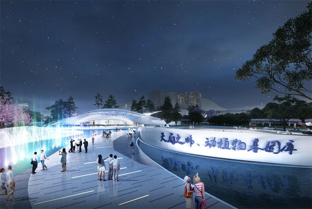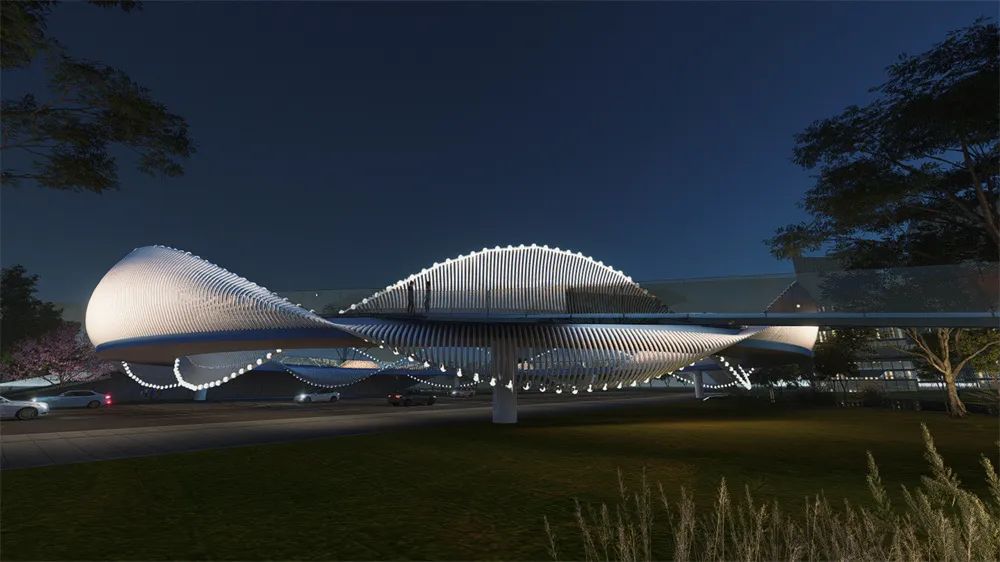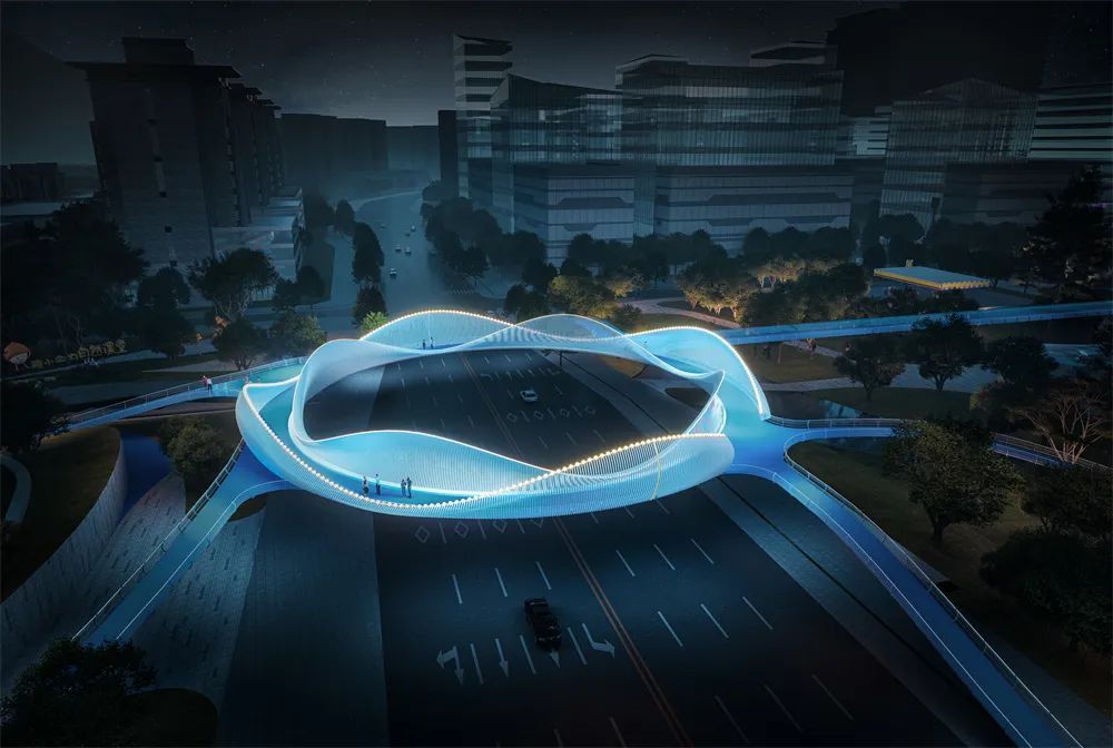 設(shè)計(jì)環(huán)形人行天橋,猶如一朵盛開(kāi)的嬌艷的花,有機(jī)聯(lián)系起項(xiàng)目的南北地塊,同時(shí)兼顧新區(qū) 大道的人行過(guò)街功能,結(jié)合燈光藝術(shù)營(yíng)造,也將成為該片區(qū)一個(gè)標(biāo)志性的打卡點(diǎn),象征著雅安因多樣而美麗,因共生而繁盛;颦h(huán)圍欄展示雅安特色物種。地面燈光按植物花色進(jìn)行分段布置,同時(shí)通過(guò)投影設(shè)備和交互式燈光等設(shè)施,增加游人體驗(yàn)感。環(huán)形橋跨越機(jī)動(dòng)車(chē)道,基因環(huán)的出現(xiàn)開(kāi)始了生物密碼的探索之旅。