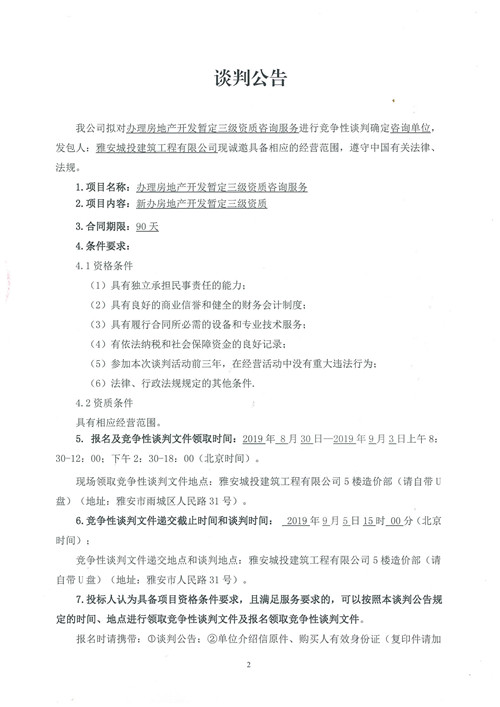 雅安城投建筑工程有限公司辦理房地產(chǎn)開發(fā)暫定三級資質(zhì)咨詢服務(wù)競爭性談判公告