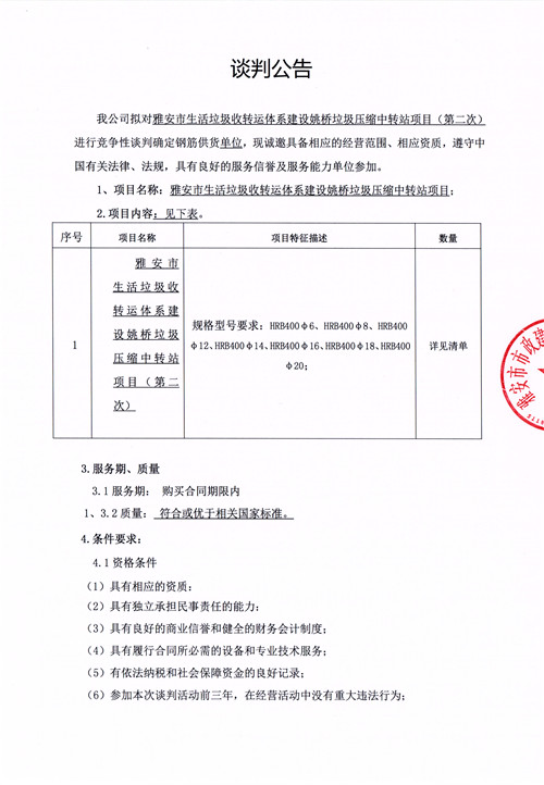 雅安市生活垃圾轉(zhuǎn)運(yùn)體系建設(shè)姚橋垃圾壓縮中轉(zhuǎn)站項(xiàng)目確定鋼筋供貨單位的競(jìng)爭(zhēng)性談判公告(第二次)