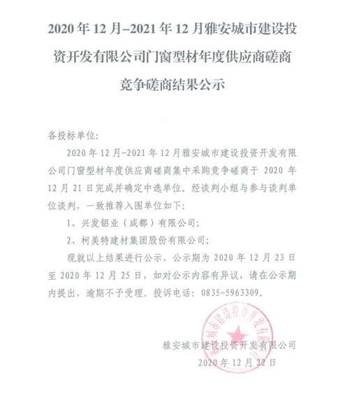 2020年12月-2021年12月雅安城市建設(shè)投資開(kāi)發(fā)有限公司門窗型材年度供應(yīng)商磋商競(jìng)爭(zhēng)磋商結(jié)果公示