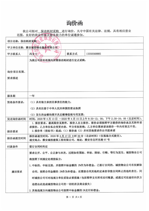 城投物業(yè)公司保潔耗材采購詢價函(第二次)