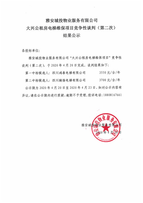 城投物業(yè)公司大興公租房電梯維保項目競爭性談判(第二次)結(jié)果公示