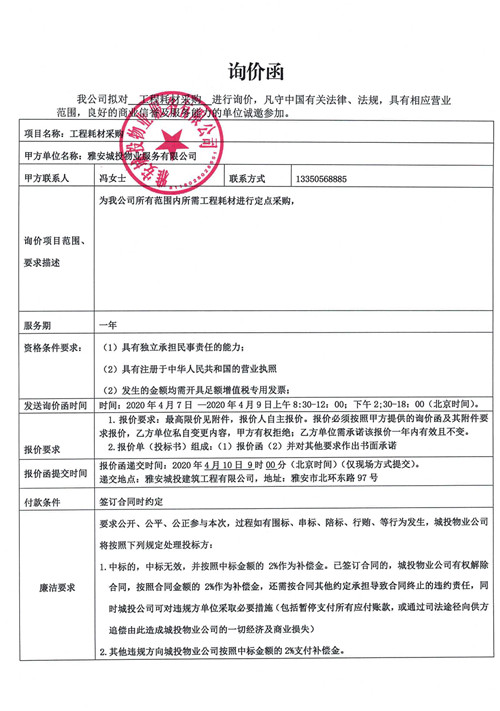 城投物業(yè)公司工程耗材采購(gòu)詢價(jià)函