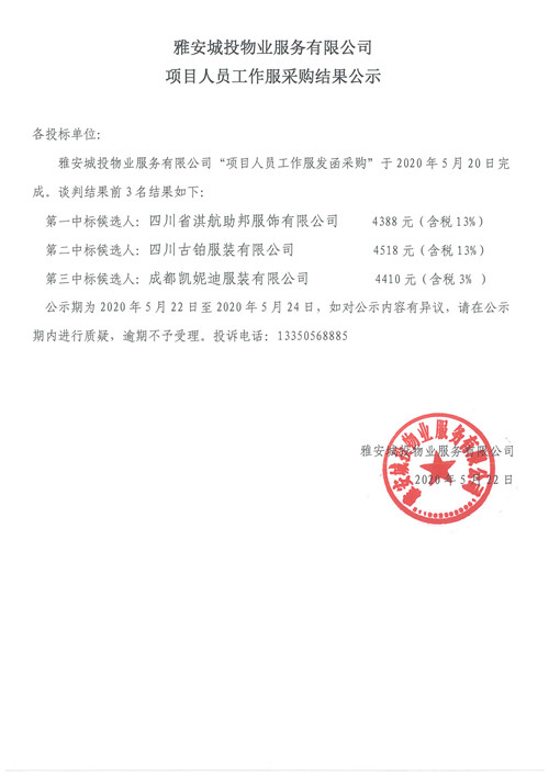 城投物業(yè)公司項目人員工作服采購結(jié)果公示