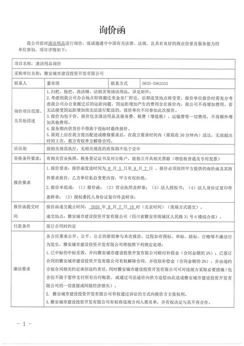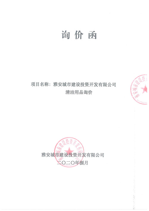 雅安城市建設(shè)投資開(kāi)發(fā)有限公司清潔用品詢價(jià)函