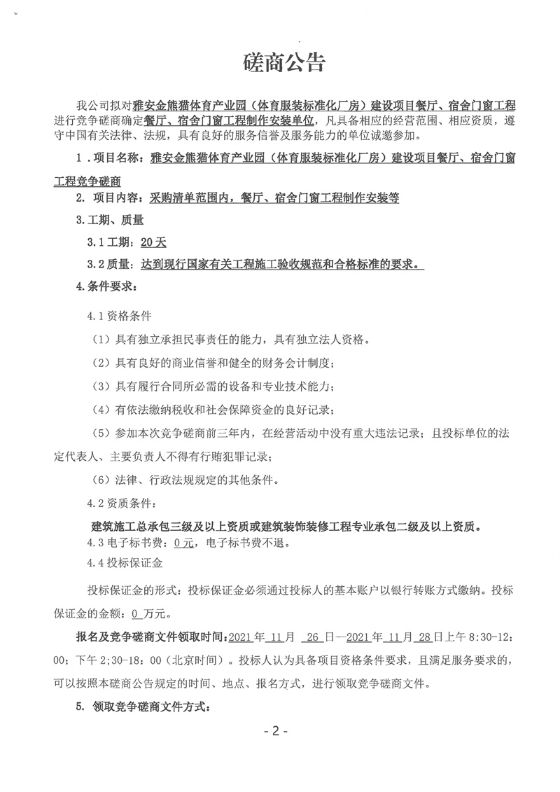 雅安金熊貓體育產(chǎn)業(yè)園(體育服裝標(biāo)準(zhǔn)化廠房)建設(shè)項目餐廳、宿舍門窗工程競爭磋商公告