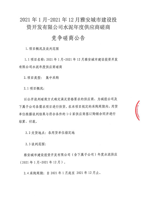 2021年1月-2021年12月雅安城市建設投資開發(fā)有限公司水泥年度供應商磋商競爭磋商公告