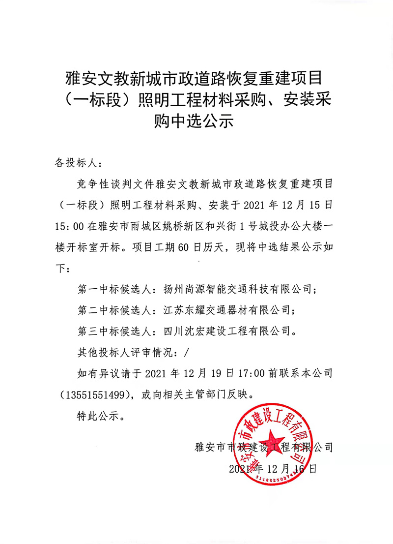 雅安文教新城市政道路恢復(fù)重建項目(一標(biāo)段)照明工程材料采購、安裝采購中選公示