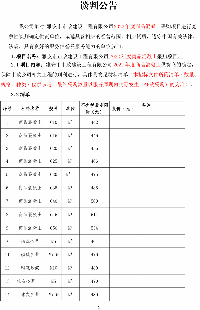 雅安市市政建設(shè)工程有限公司2022年度商品混凝土采購項(xiàng)目競(jìng)爭(zhēng)性談判公告