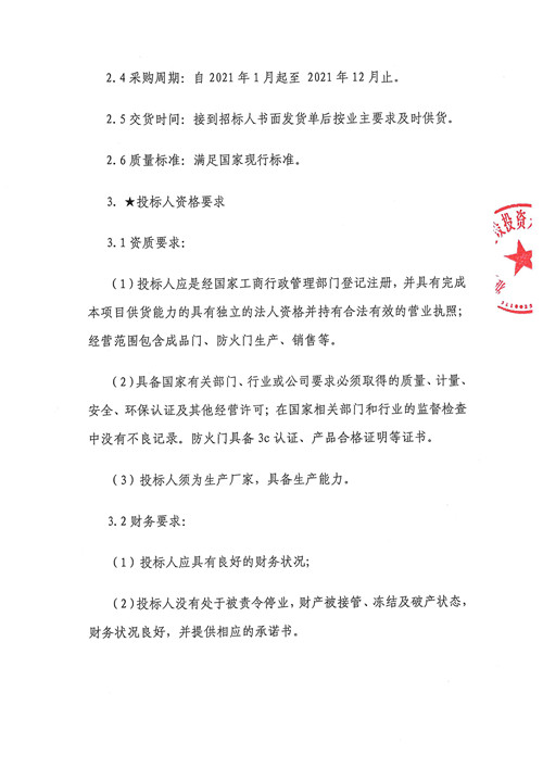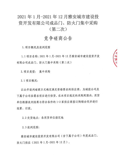 2021年1月-2021年12月雅安城市建設投資開發(fā)有限公司成品門、防火門集中采購(第二次)競爭磋商公告