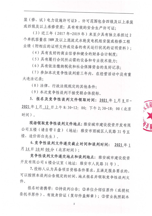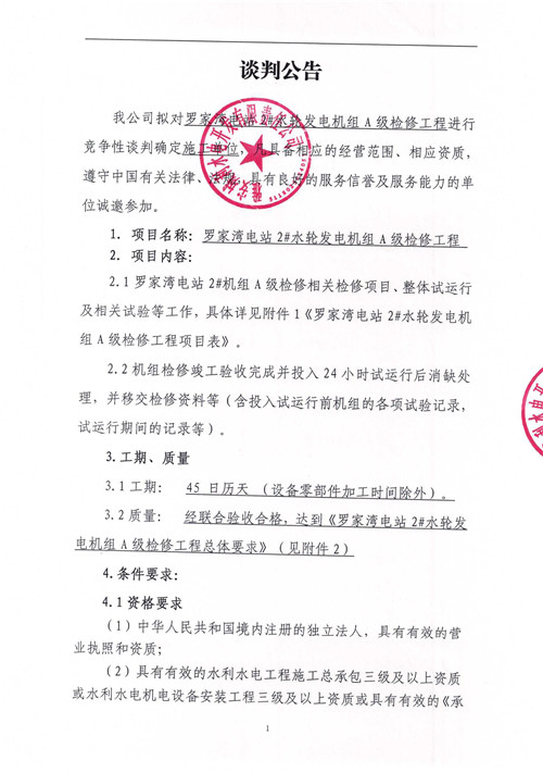 城利水電公司羅家灣電站2#水輪發(fā)電機組A級檢修工程競爭性談判公告