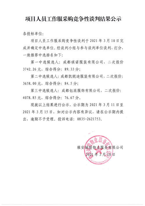 城投物業(yè)公司項(xiàng)目人員工作服采購競爭性談判結(jié)果公示