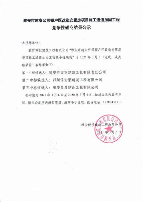 城投建工公司雅安市建安公司棚戶區(qū)改造安置房項目施工通道加固工程競爭性磋商結(jié)果公示