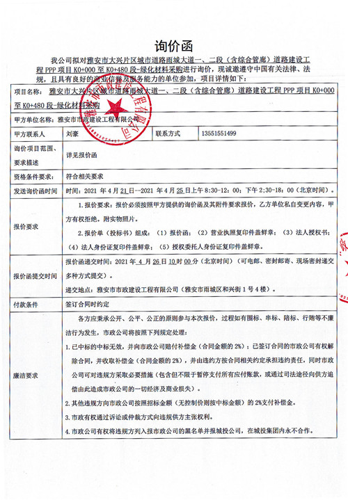 雅安市大興片區(qū)城市道路雨城大道一、二段(含綜合管廊)道路建設(shè)工程PPP項(xiàng)目K0+000至K0+480段-綠化材料采購(gòu)詢價(jià)函
