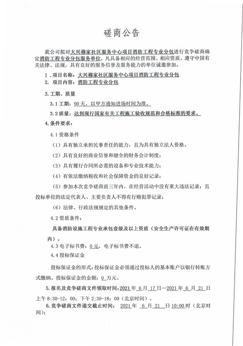 城投建工公司大興穆家社區(qū)服務(wù)中心項(xiàng)目消防工程專業(yè)分包競爭性磋商公告