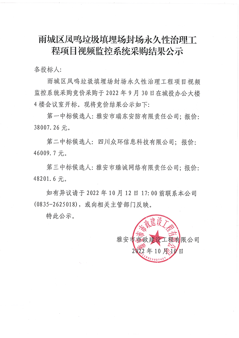 雨城區(qū)鳳鳴垃圾填埋場永久性封場治理工程項(xiàng)目視頻監(jiān)控系統(tǒng)采購結(jié)果公示