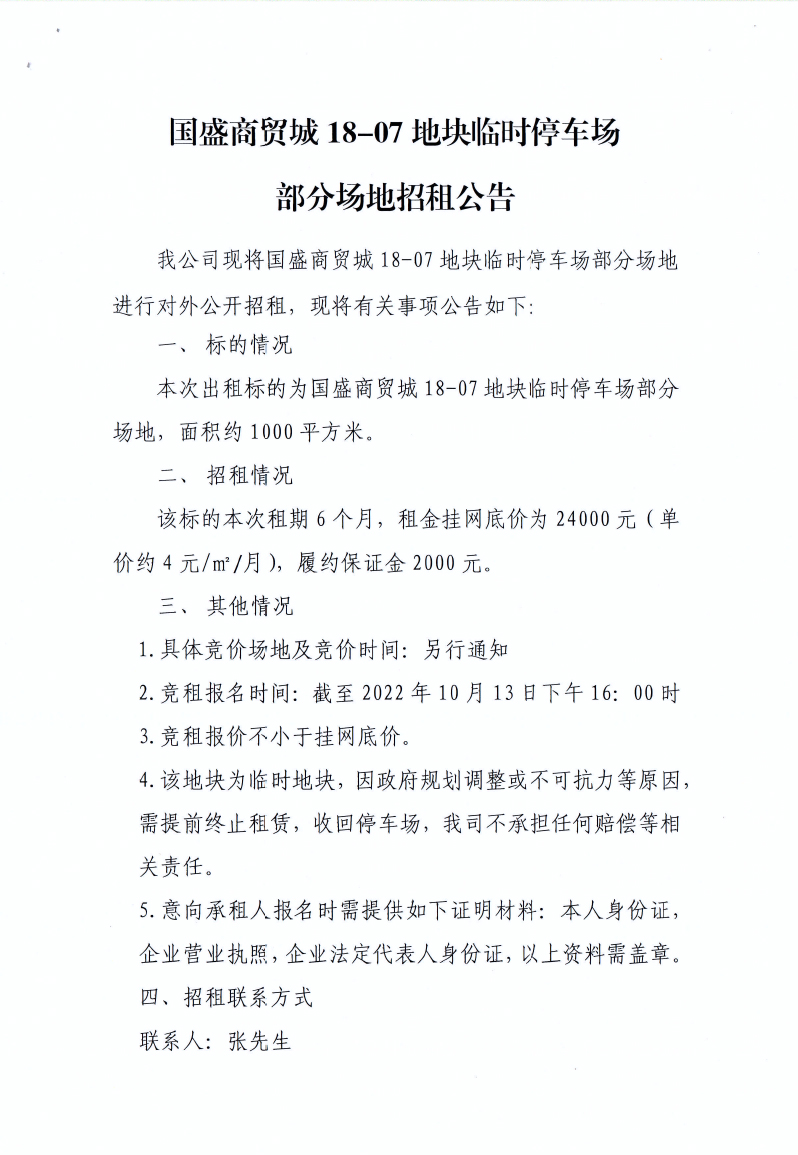 國(guó)盛商貿(mào)城18-07地塊臨時(shí)停車(chē)場(chǎng)部分場(chǎng)地招租公告