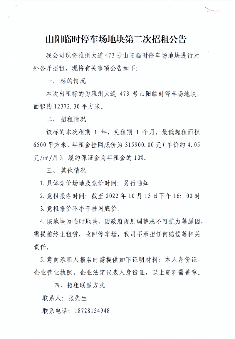 山陽(yáng)臨時(shí)停車(chē)場(chǎng)地塊第二次招租公告
