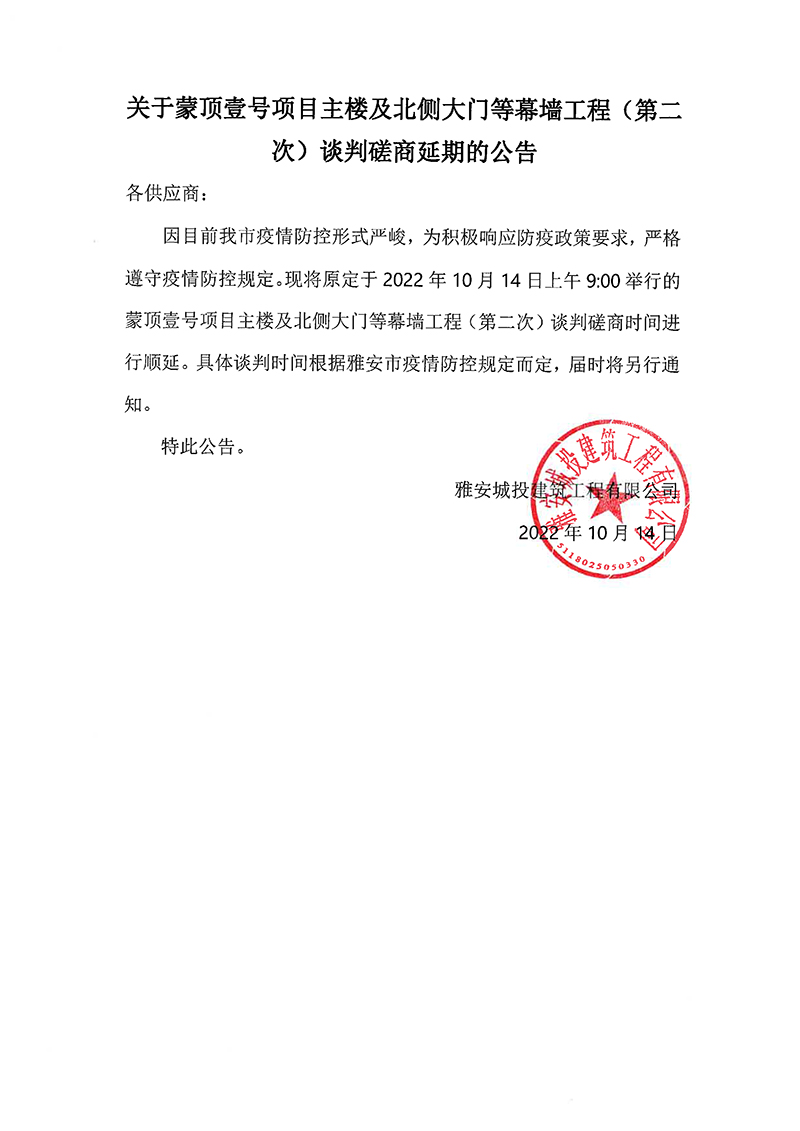 蒙頂壹號項(xiàng)目主樓及北側(cè)大門等幕墻工程(第二次)談判磋商延期的公告