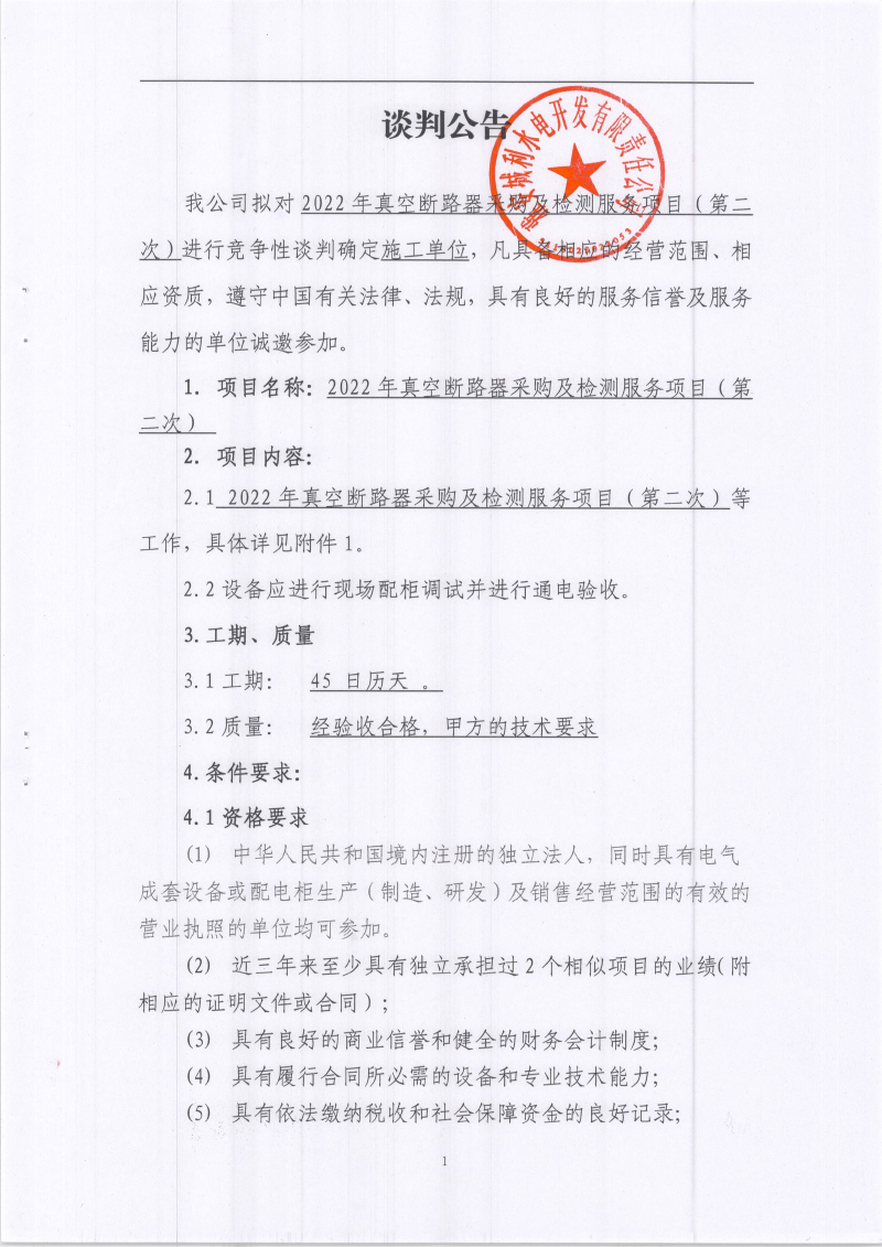 城利水電公司2022年真空斷路器采購及檢測服務項目(第二次)競爭性談判