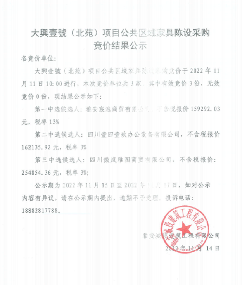 大興壹號(hào)(北苑)項(xiàng)目公共區(qū)域家具陳設(shè)采購競價(jià)結(jié)果公示