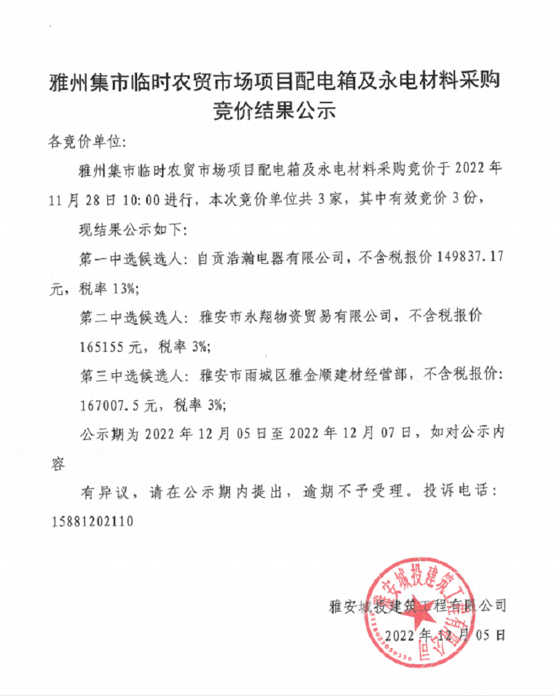 雅州集市臨時農(nóng)貿(mào)市場項目配電箱及永電材料采購競價結(jié)果公示