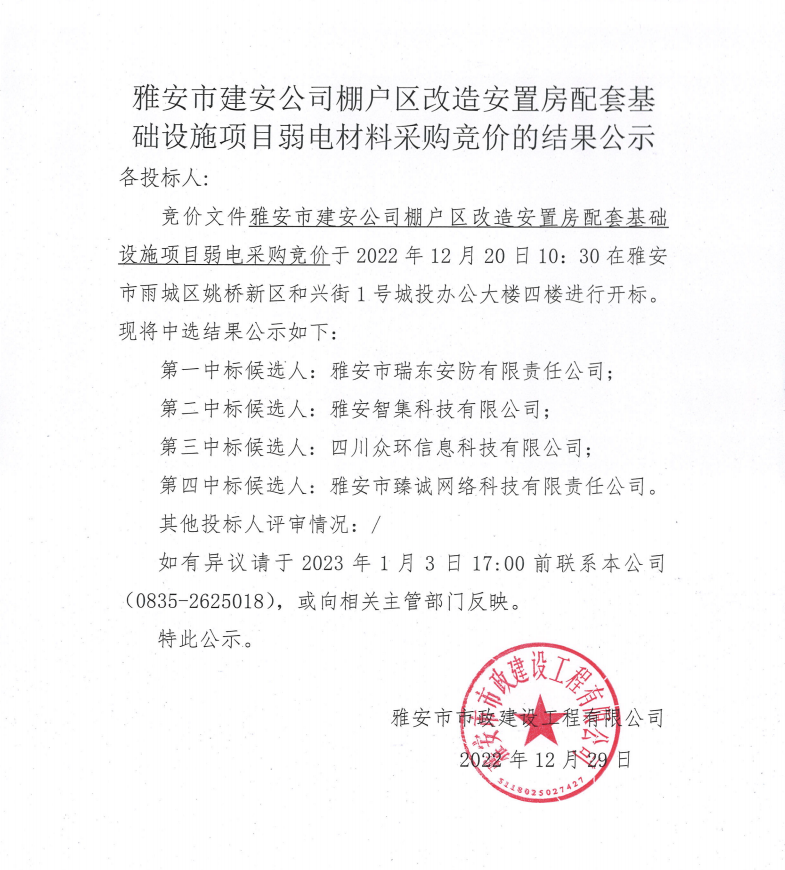 雅安市建安公司棚戶區(qū)改造安置房配套基礎(chǔ)設(shè)施項目弱電材料采購競價結(jié)果公示