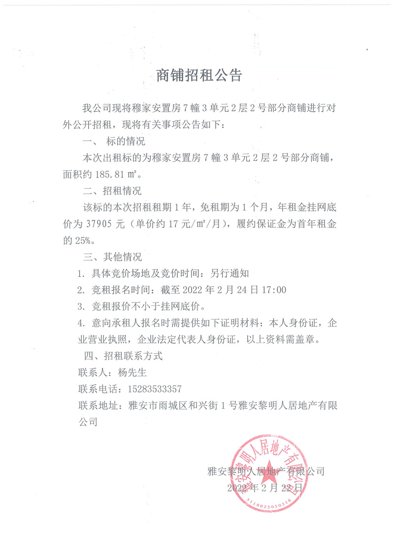 穆家安置房7幢3單元2層2號部分商鋪招租公告