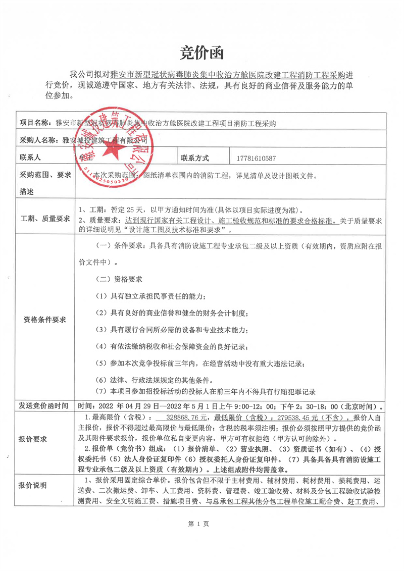雅安市新型冠狀病毒肺炎集中收治方艙醫(yī)院改建工程項(xiàng)目消防工程采購(gòu)競(jìng)價(jià)公告