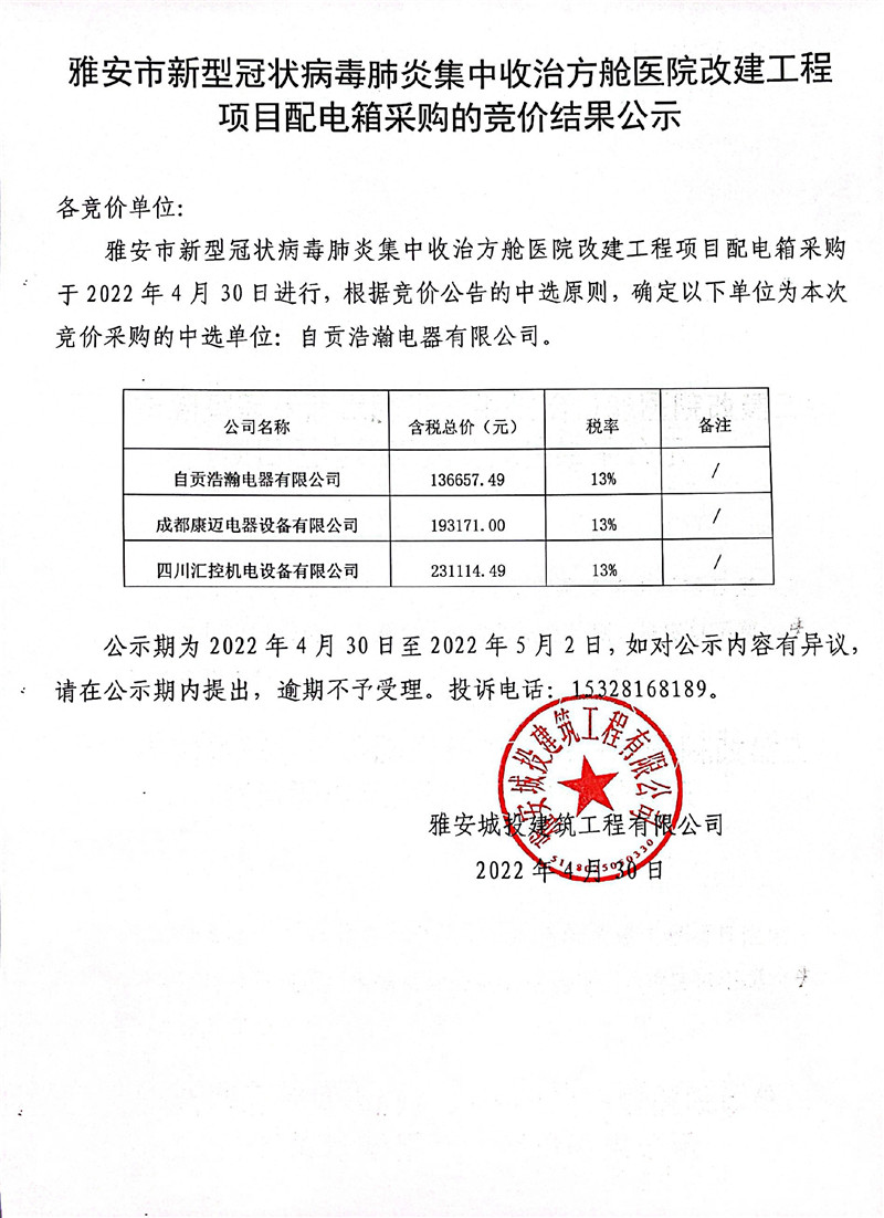 雅安市新型冠狀病毒肺炎集中收治方艙醫(yī)院改建工程項目配電箱采購的競價結果公示