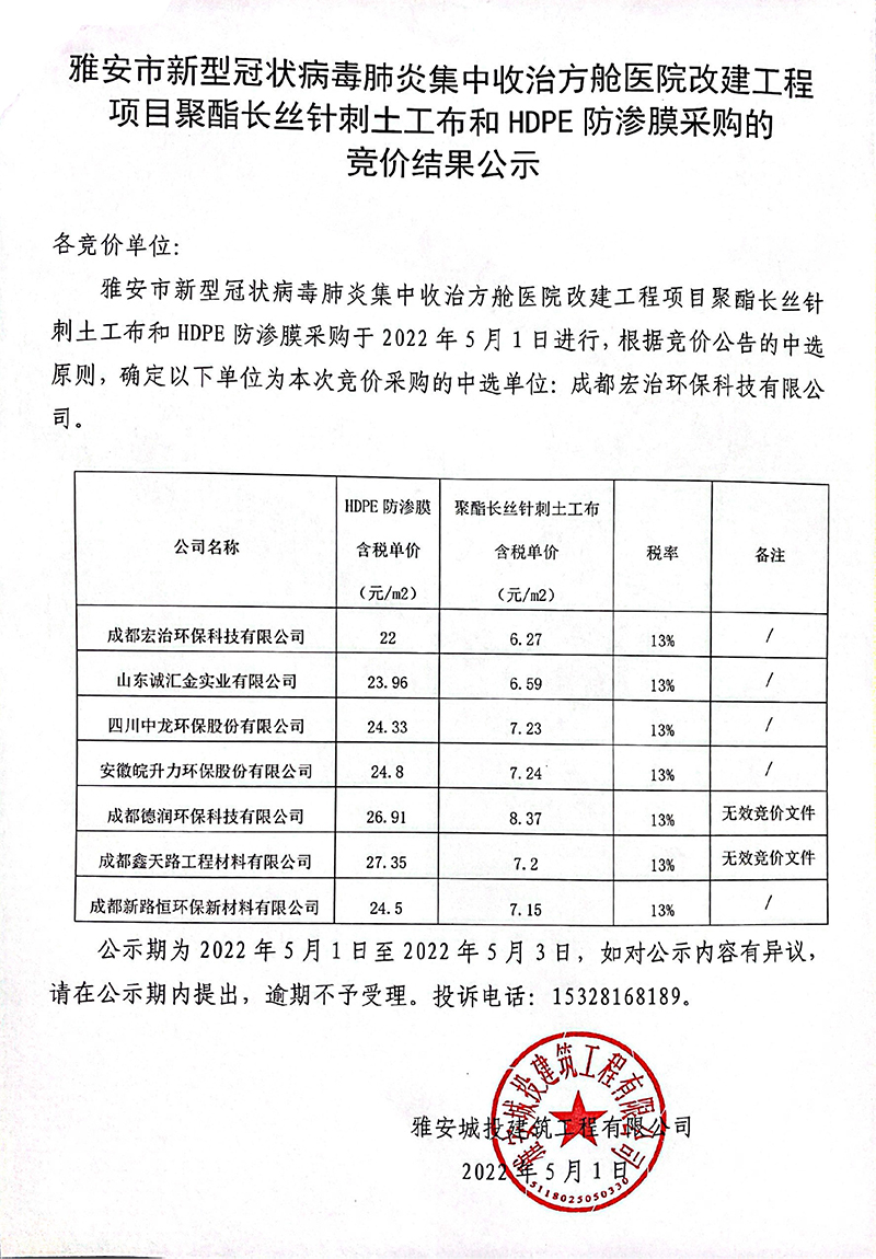 關(guān)于雅安市新型冠狀病毒肺炎集中收治方艙醫(yī)院改建工程項目聚酯長絲針刺土工布和HDPE防滲膜采購的競價結(jié)果公示