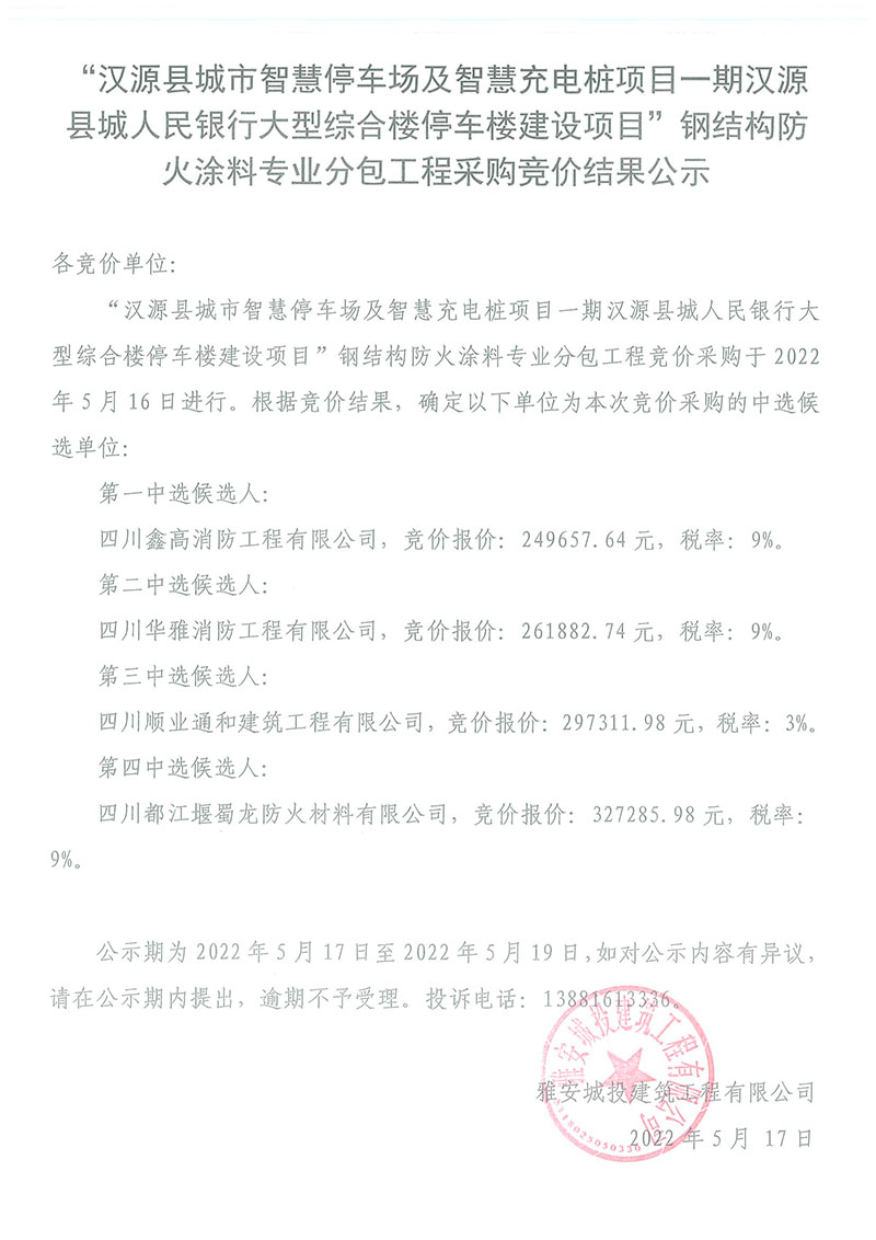 漢源縣城市智慧停車場及智慧充電樁項目一期漢源縣城人民銀行大型綜合樓停車樓建設(shè)項目防火涂料專業(yè)分包工程采購競價結(jié)果公示