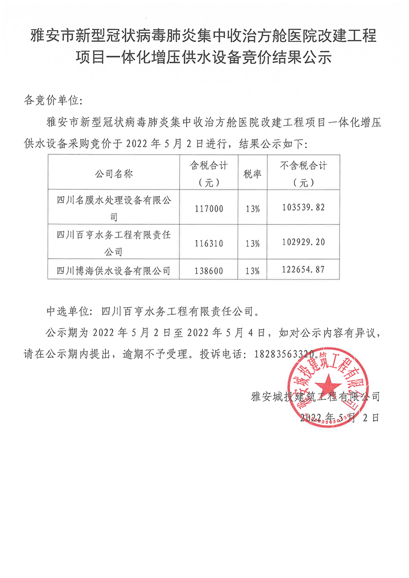 雅安市新型冠狀病毒肺炎集中收治方艙醫(yī)院改建工程項(xiàng)目一體化增壓供水設(shè)備競價(jià)結(jié)果公示