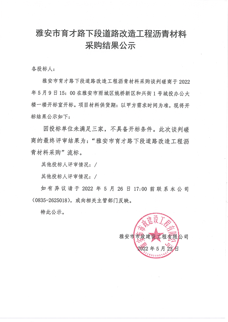 雅安市育才路下段道路改造工程瀝青材料采購結果公示