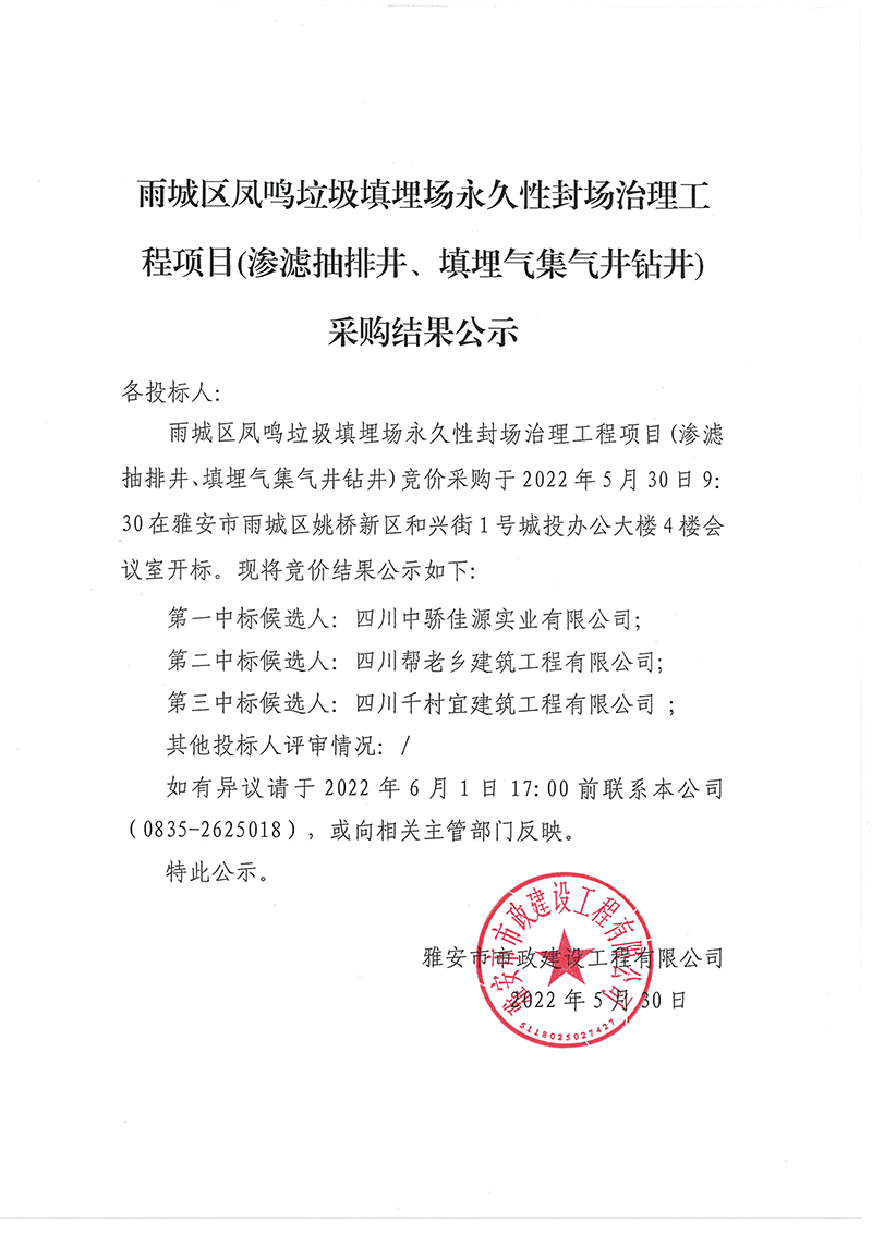 雨城區(qū)鳳鳴垃圾填埋場永久性封場治理工程項目(滲濾抽排井、填埋氣集氣井鉆井)采購結果公示