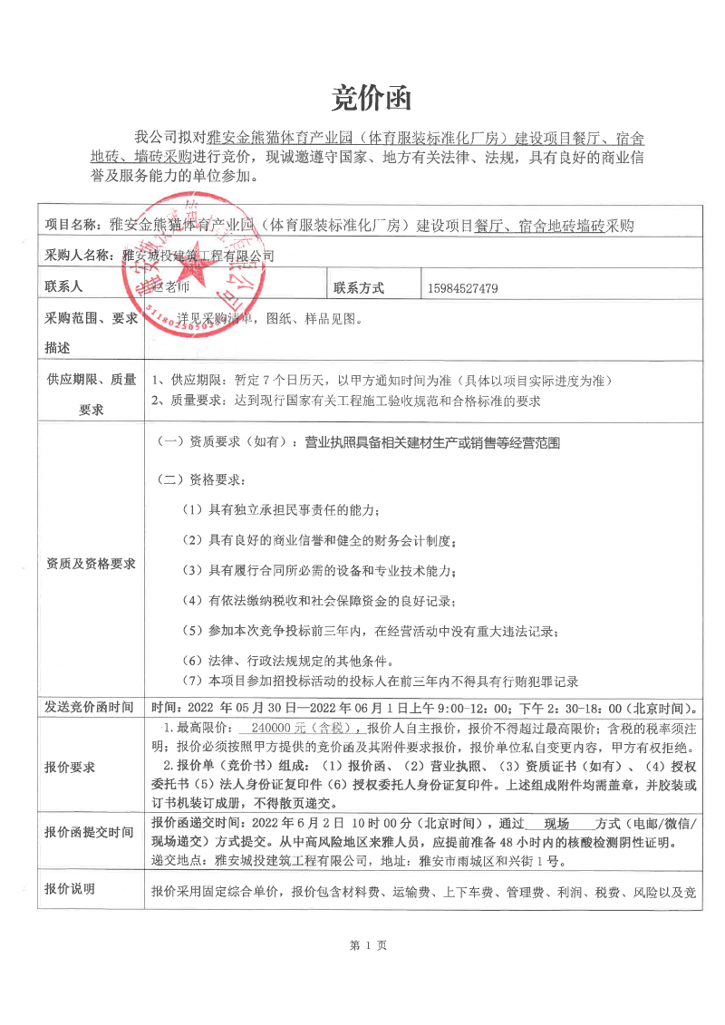 雅安金熊貓?bào)w育產(chǎn)業(yè)園(體育服裝標(biāo)準(zhǔn)化廠房)建設(shè)項(xiàng)目餐廳、宿舍地磚、墻磚競價采購