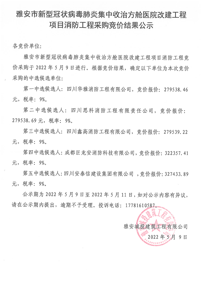 雅安市新型冠狀病毒肺炎集中收治方艙醫(yī)院改建工程項目消防工程采購競價結(jié)果公示