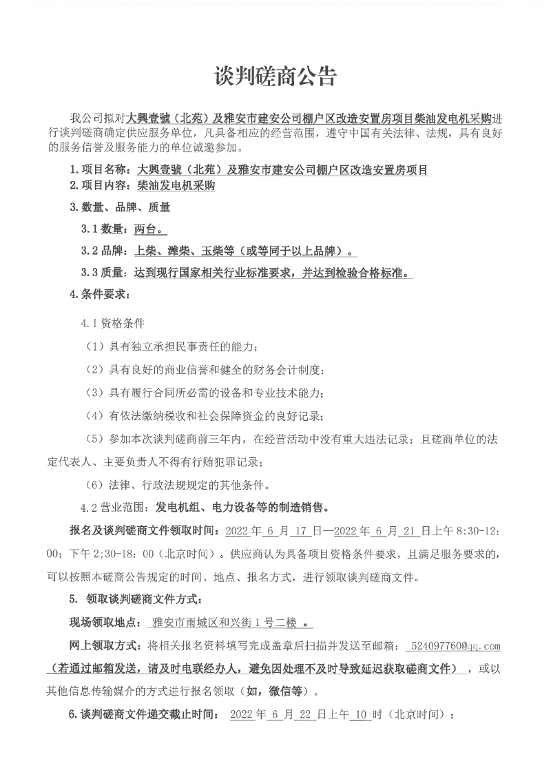 大興壹號(hào)(北苑)及雅安市建安公司棚戶區(qū)改造安置房項(xiàng)目柴油發(fā)電機(jī)采購(gòu)談判磋商公告