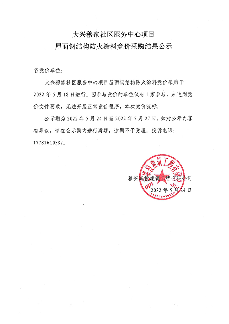 大興穆家社區(qū)服務(wù)中心項(xiàng)目屋頂鋼結(jié)構(gòu)防火涂料競(jìng)價(jià)采購結(jié)果公示