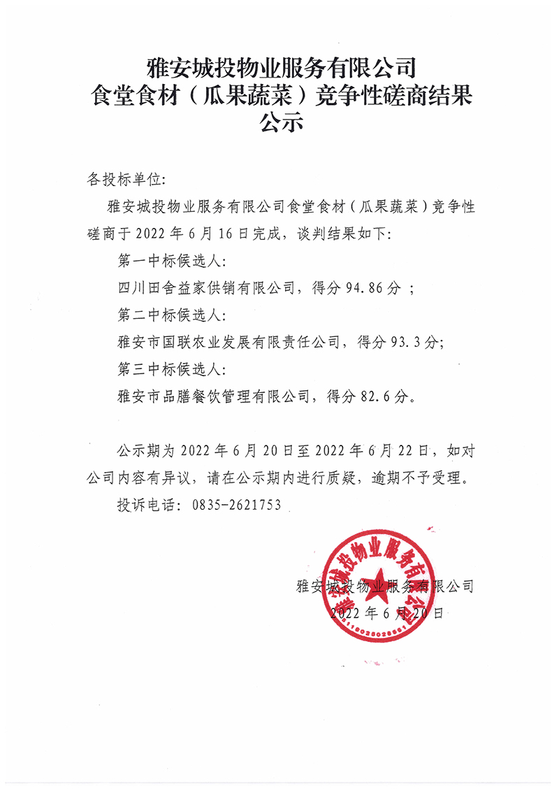 城投公司食堂食材(瓜果蔬菜)采購項目談判磋商結果公示