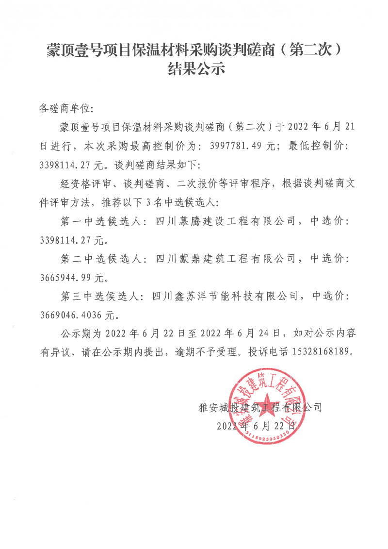 蒙頂壹號項目保溫材料采購談判磋商(第二次)結果公示