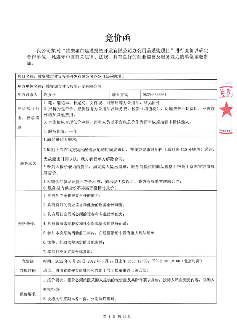 雅安城市建設(shè)投資開發(fā)有限公司辦公用品采購項(xiàng)目競(jìng)價(jià)公告
