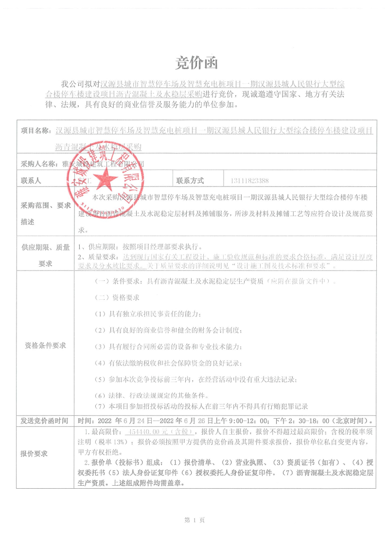 漢源縣城市智慧停車(chē)場(chǎng)及智慧充電樁項(xiàng)目一期漢源縣城人民銀行大型綜合樓停車(chē)樓建設(shè)項(xiàng)目瀝青混凝土、水穩(wěn)層采購(gòu)競(jìng)價(jià)公告