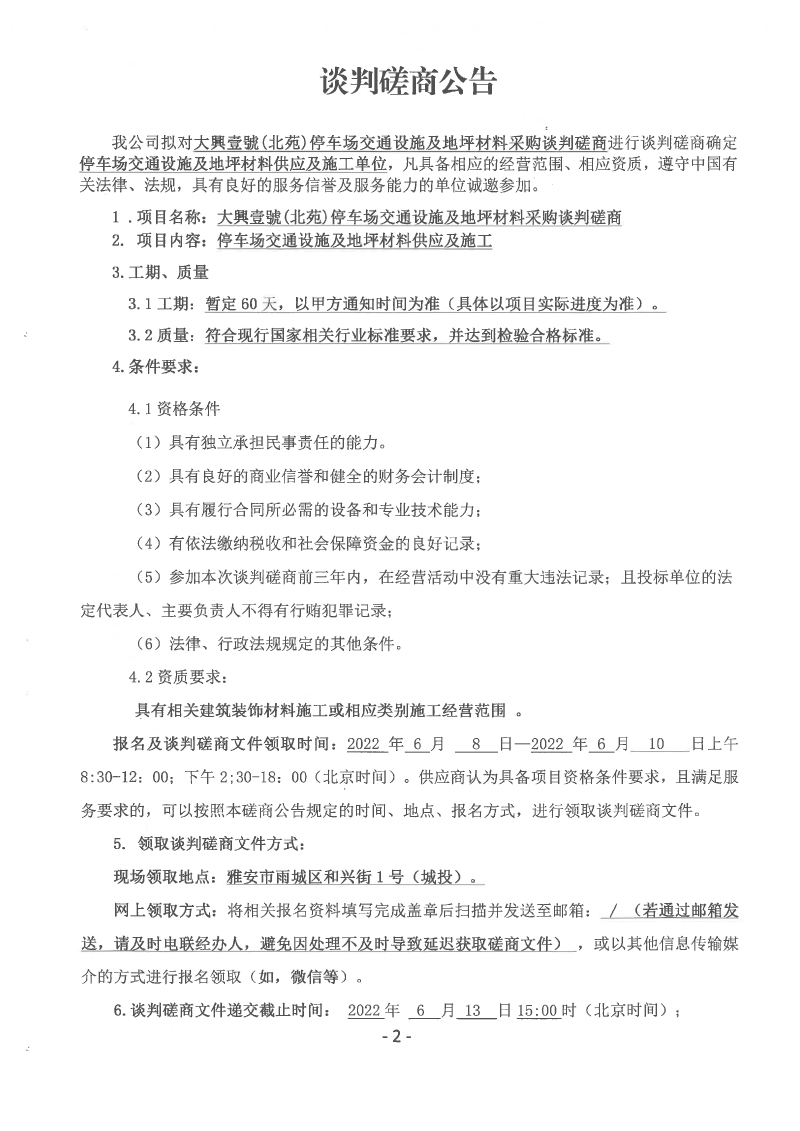 大興壹號(hào)(北苑)停車(chē)場(chǎng)交通設(shè)施及地坪材料采購(gòu)談判磋商公告