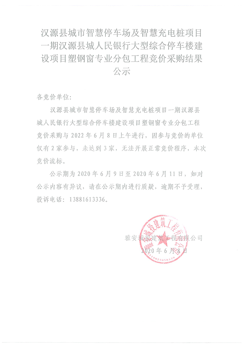 漢源縣城市智慧停車場(chǎng)及智慧充電樁項(xiàng)目一期漢源縣城人民銀行大型綜合樓停車樓建設(shè)項(xiàng)目塑鋼窗專業(yè)分包工程競(jìng)價(jià)采購(gòu)結(jié)果公示