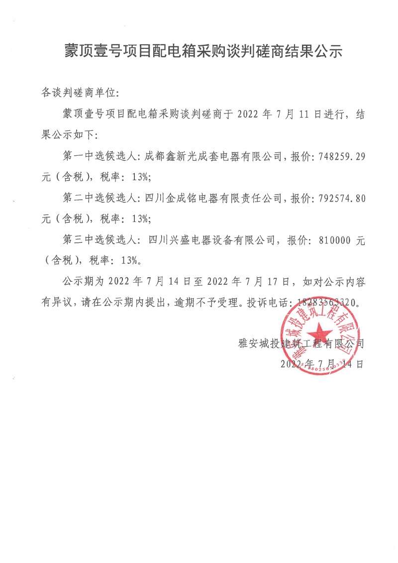蒙頂壹號項目配電箱采購談判磋商結果公示