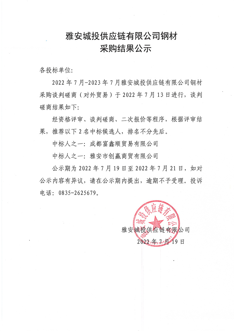 雅安城投供應鏈有限公司鋼材采購結(jié)果公示