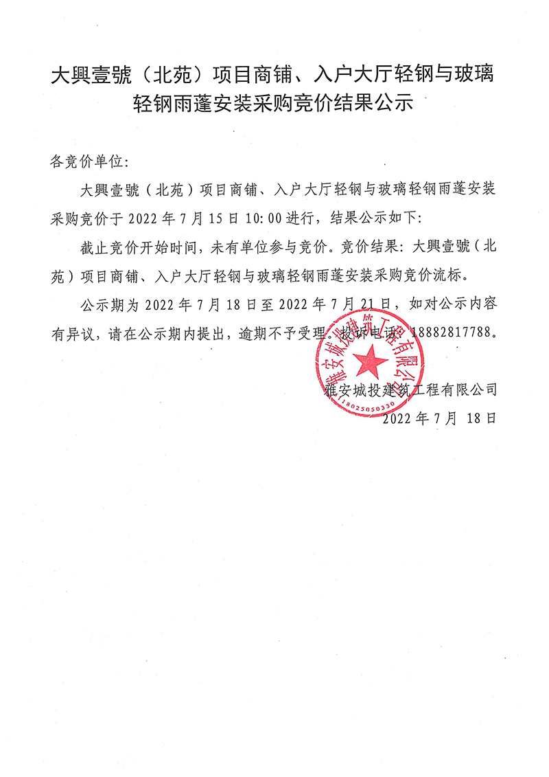 大興壹號(hào)(北苑)項(xiàng)目商鋪、入戶大廳輕鋼與玻璃輕鋼雨蓬安裝采購(gòu)競(jìng)價(jià)結(jié)果公示