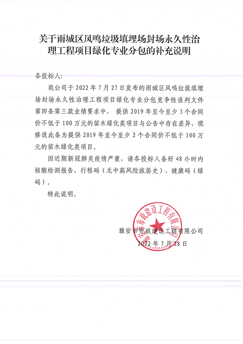 關于雨城區(qū)鳳鳴垃圾填埋場封場永久性治理工程項目綠化專業(yè)分包的補充說明