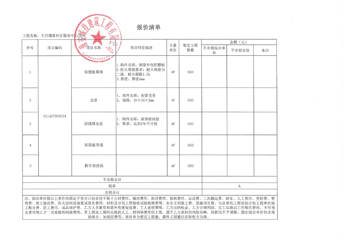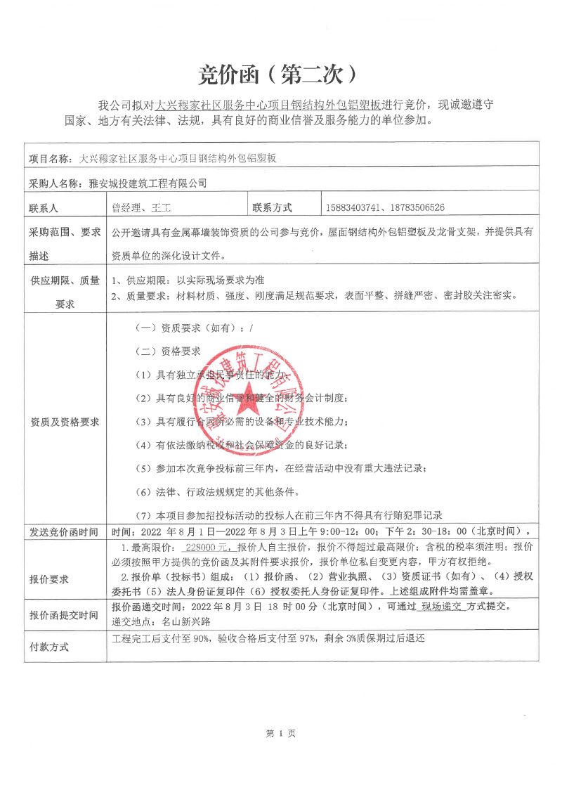 大興穆家社區(qū)服務中心項目鋼結構外包鋁塑板競價公告(第二次)